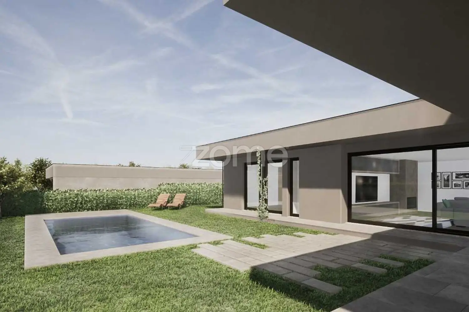 No exterior, os espaços ajardinados criam um ambiente harmonioso, complementado por uma piscina em betão revestida a tela armada, ideal para momentos de lazer e descontração