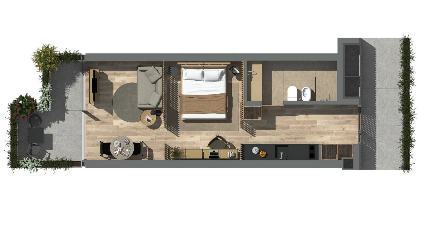 In building B, there will be 28 residential apartments with T1, T2, and T3 layouts, featuring balconies/terraces and parking. These residents can also enjoy Housekeeping services, including cleaning and laundry.
