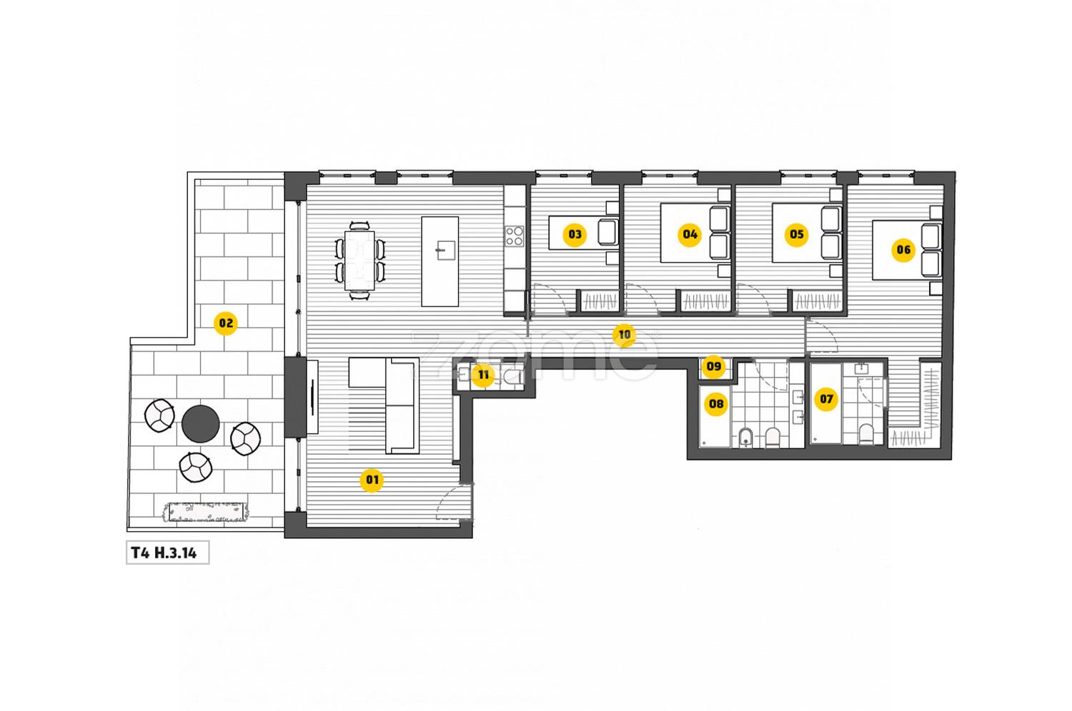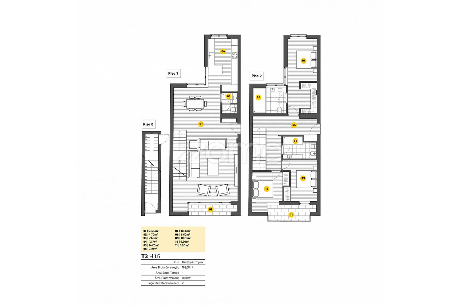 On the distribution hall of the Ground Floor, there is access to five housing units, three to the rear and two to the front. The rear-developing housing units, all in a T2 model, are described as having an entrance hall supported by a social sanitary installation, followed by a multifunctional space for a living room, dining area, kitchen, and laundry space. This initial space is supported by a patio that intertwines with the bedroom area connected through a corridor that occasionally shares the patio's light. In the bedroom area, two suites are developed, one that shares this patio and the other where the constructed part ends, with another private terrace area for this space. The three units are very similar in their typological characterization. NH.0.1 H.0.2 H.0.3.