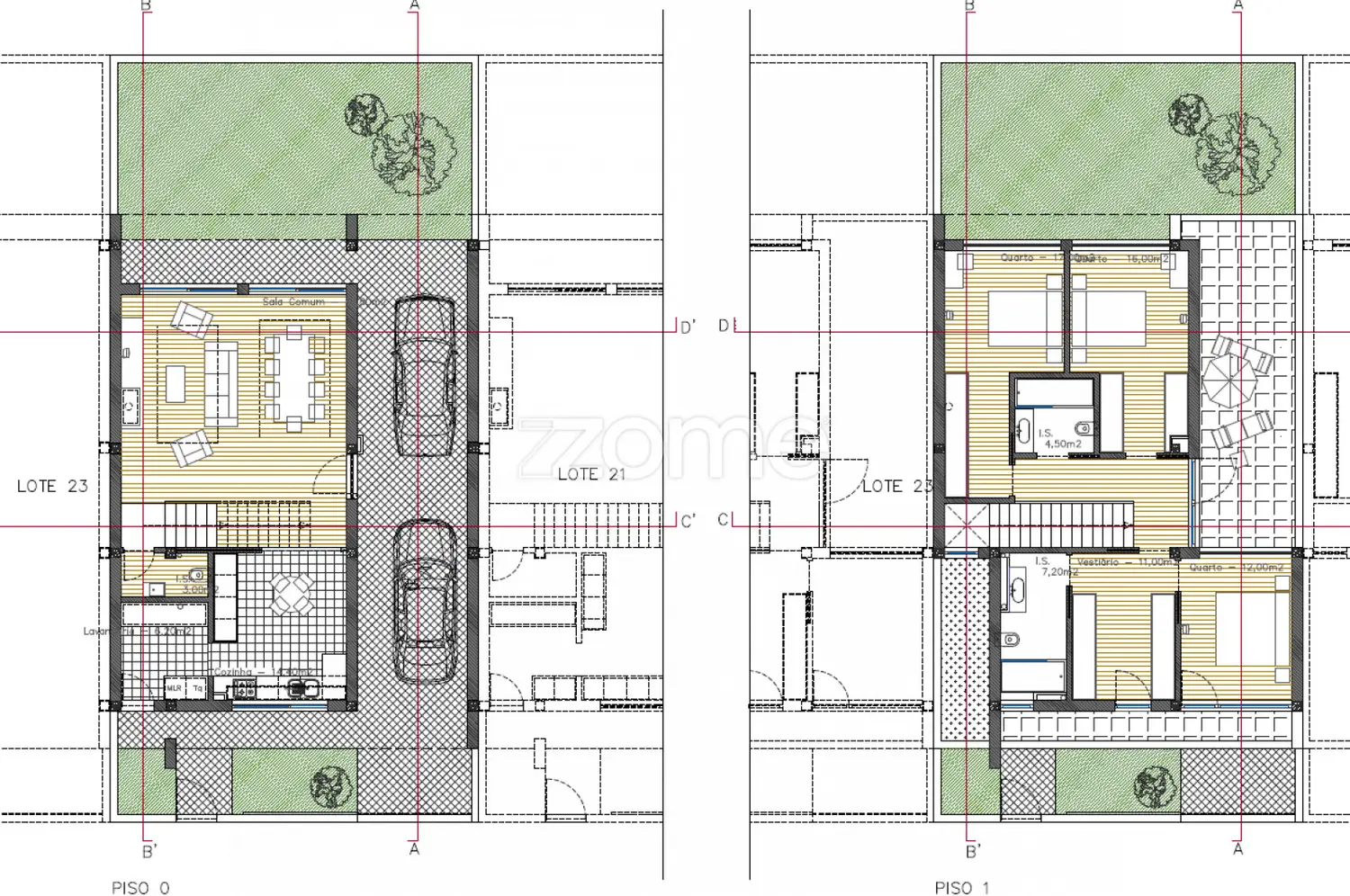 The three-bedroom villas privilege the alliance between the living spaces and the outside. Their large windows allow not only natural light to enter, but also a constant connection with the outside spaces (terraces, gardens and nature). The houses are generously sized, with finishings in fine materials that entail low maintenance costs. In addition, the project was designed so that the walls of the houses do not touch the neighbouring houses, thus providing greater comfort and convenience.